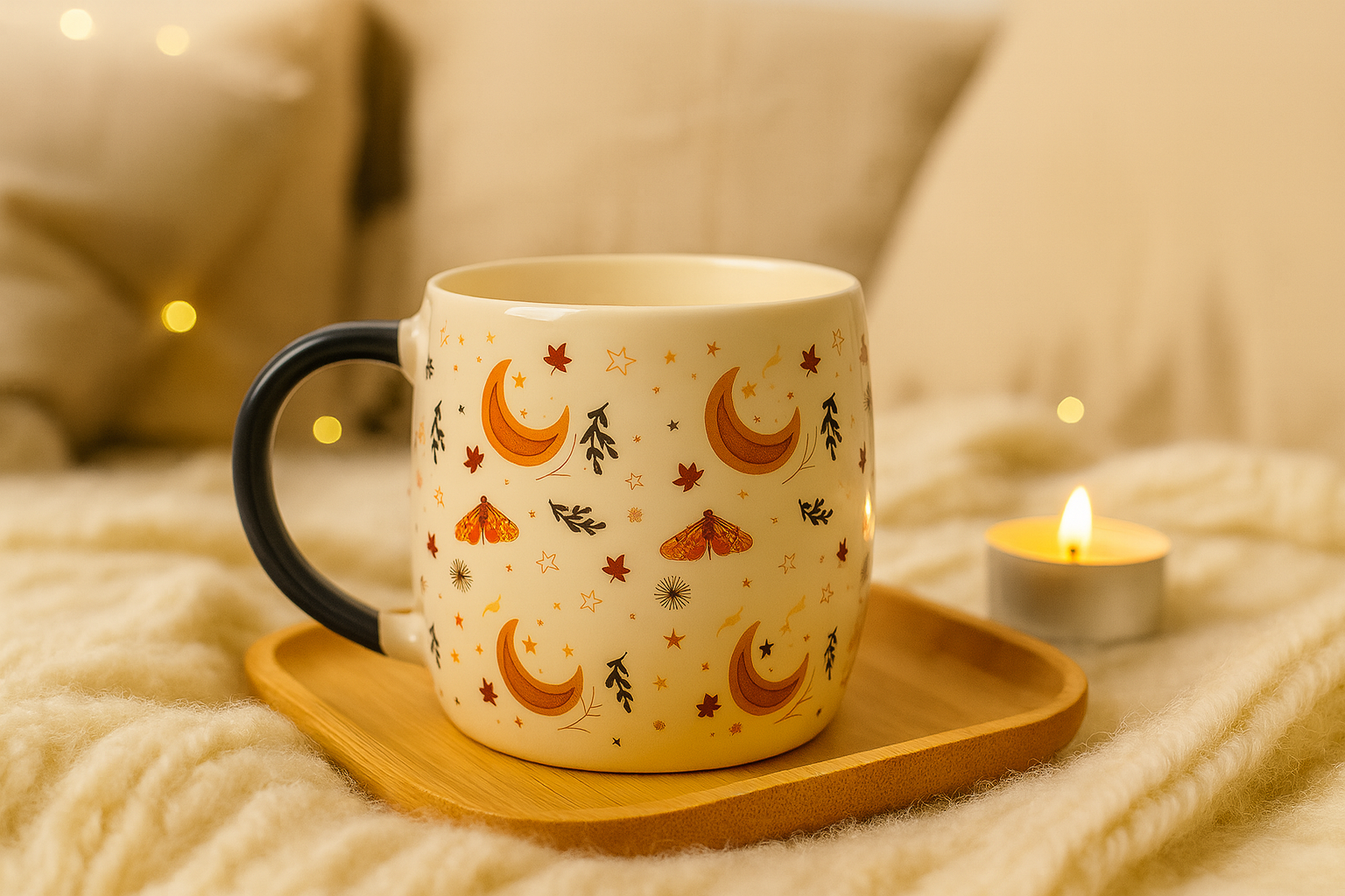 🦋 Savourez votre boisson automnale préférée dans cette tasse en céramique ivoire, ornée d'une élégante lune des moissons entourée de feuilles délicates et d'étoiles dorées. Le choix parfait pour des soirées cosy ou comme cadeau pour quiconque adore la beauté de la saison 🍂
